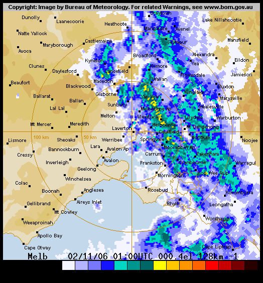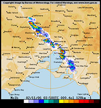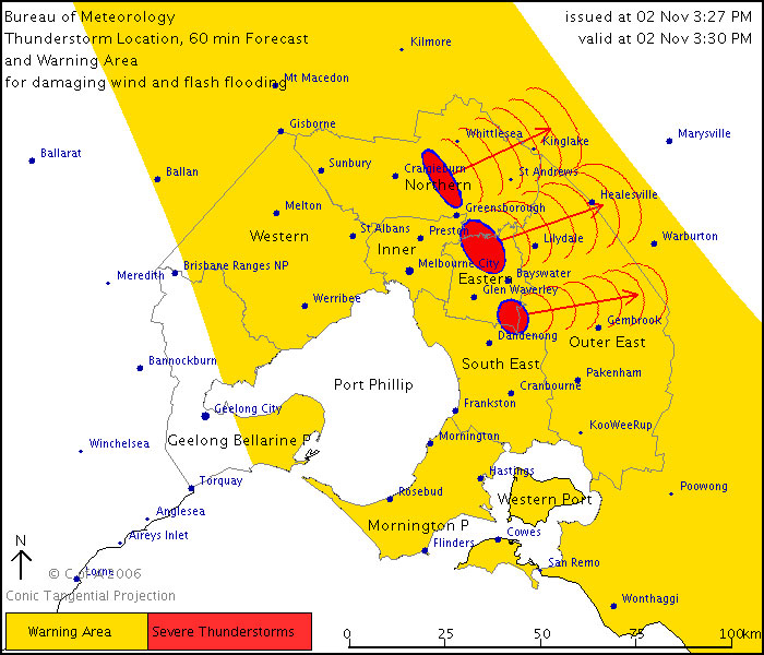 The Bureau of Meteorology warns that, at 3:30 PM, severe thunderstorms were detected on weather radar near Greensborough, Ringwood, Scoresby and Belgrave. These thunderstorms are moving towards the east to northeast. They are forecast to affect Hurstbridge, Whittlesea, Lilydale and Yarra Glen by 4:00 PM and Kinglake, Healesville, the area south of Healesville and the area east of Healesville by 4:30 PM.