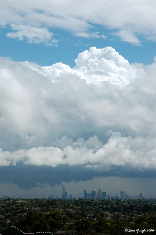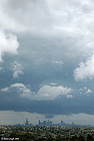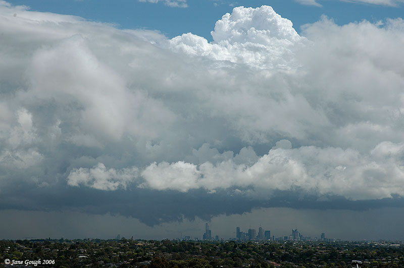 As the cloud band retreated East and the sun broke through I could see on the distant Western horizon a line of forming towers! I checked the radar image and noticed a line forming just west of Geelong. I grabbed my camera gear and headed up to Doncaster Shopping Town rooftop car park to watch the line develop over the city and slowly head towards me! Unfortunately there was quite a lot of mid level cloud streaming in obscuring my view of the crispy updraft, but managed to take a few images when I could. I was also interested in the base features swirling above the city!