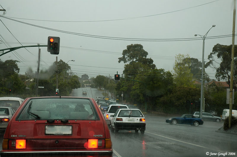 Driving through Box Hill it was apparent that the line was ever encroaching and I was soon going to experience a deluge, one of which I hadn't driven through for what seemed liked years! The huge drops began sporadically, but then the heavens literally opened up and I was soon surrounded by water covering the roads and the drains completely over flowing. What a sight!