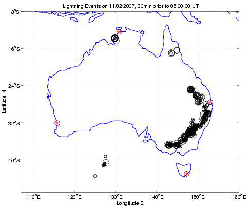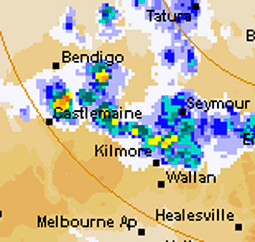 The satellite image below shows the multicell line through Castlemaine to Kilmore at approximately 4:30pm. The Lightning Tracker shows images from approximately 2:50pm, 3:30pm and 4:30pm respectively. Thanks to Strike One.