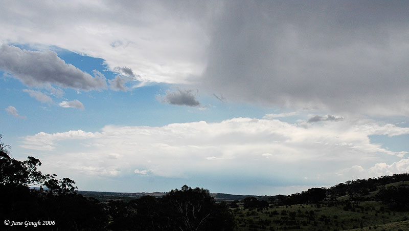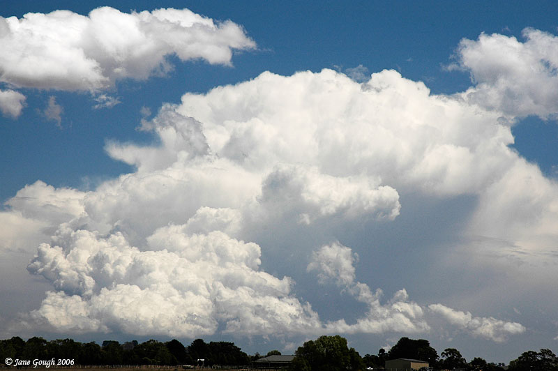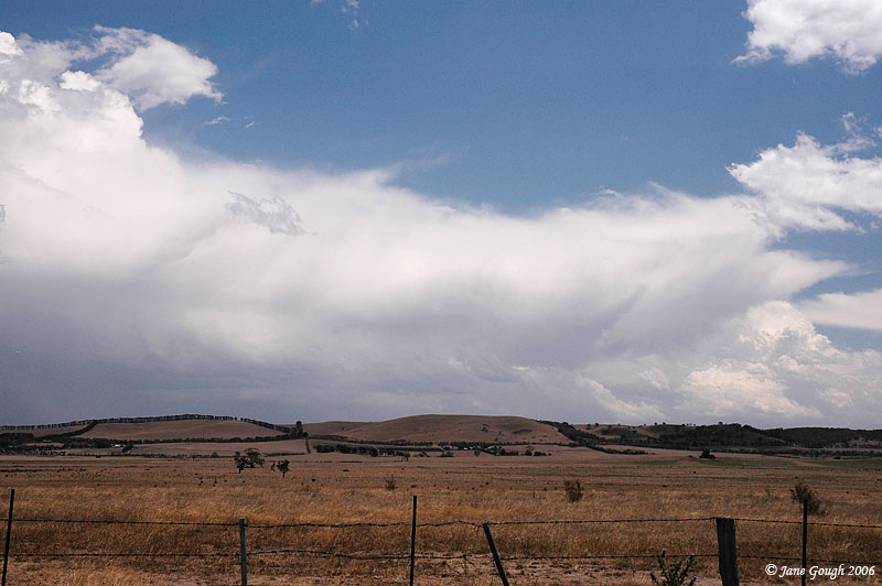 We had turned off the Northern HWY at Kilmore and traveled towards the Calder FWY via Lancefield. At 2:10pm we noticed through trees and hills that the back end of the original Riddells Creek/Macedon cell had literally put up some explosive updrafts. It was an amazing sight, but due to the local topography and foliage, it made viewing the base of the updrafts a little tricky! It didn't last terribly long however, and 15 minutes later all that was left of it was some fibrous anvil!