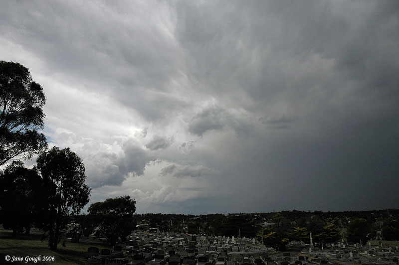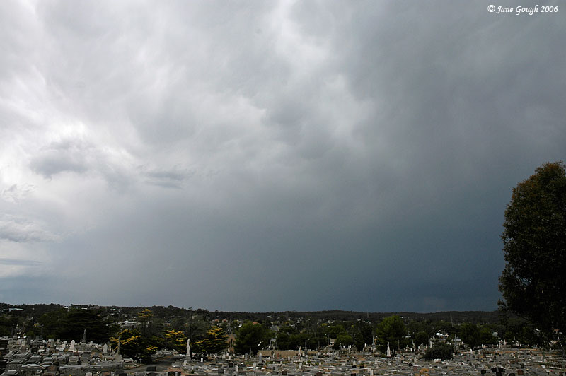 Finding a vantage point in Bendigo was certainly a challenge, and we didn't want to get too far away from the rumbling cell that was to the SE of us. We knew there wasn't a good viewing spot down the Calder to the South, so we drove to the east, and came across a great spot in Flora Hill overlooking the cemetery at 3.55pm. Mammatus was still trying to form overhead, and distant rumbles could be heard, although we didn't observe any lightning at this stage.