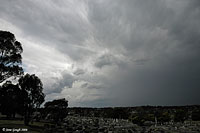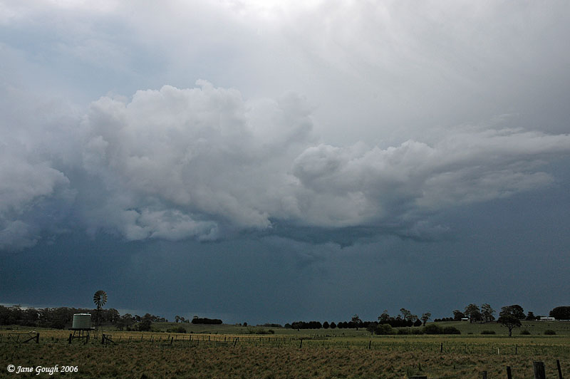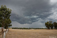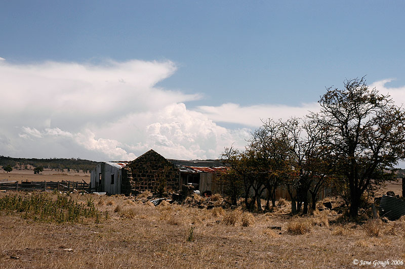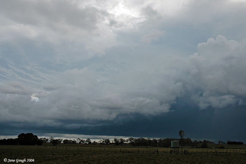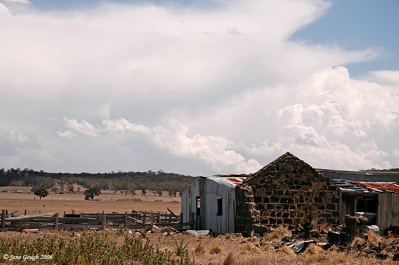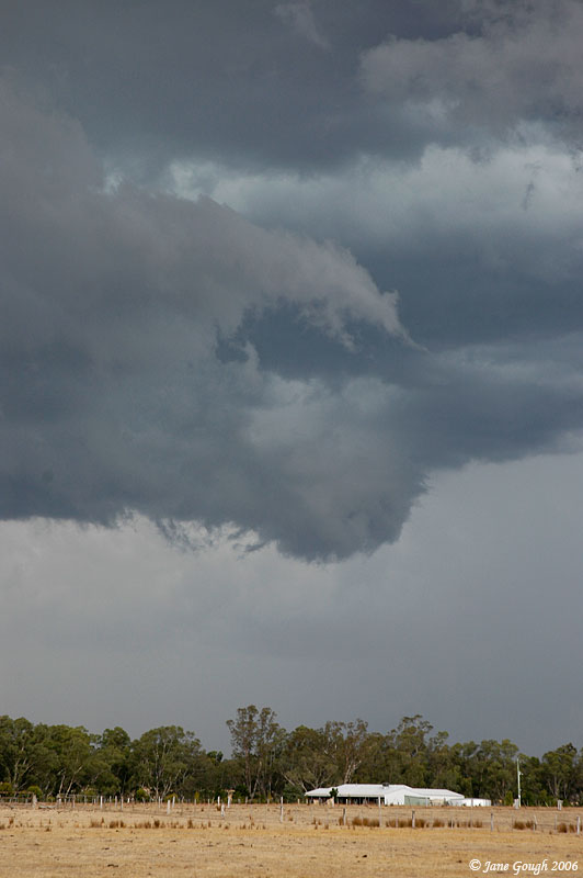 My chase partner and I began our journey from the SE Suburbs in clear skies at 1pm, and headed roughly North West towards the Central Ranges along the Hume HWY. We could see upon leaving development already towards the North. As we drove through Wallan, we stopped to photograph the back end of a cell which was passing over the Riddells Creek towards Macedon area. We took the Northern HWY towards Kilmore and also photographed it behind some farm building ruins!