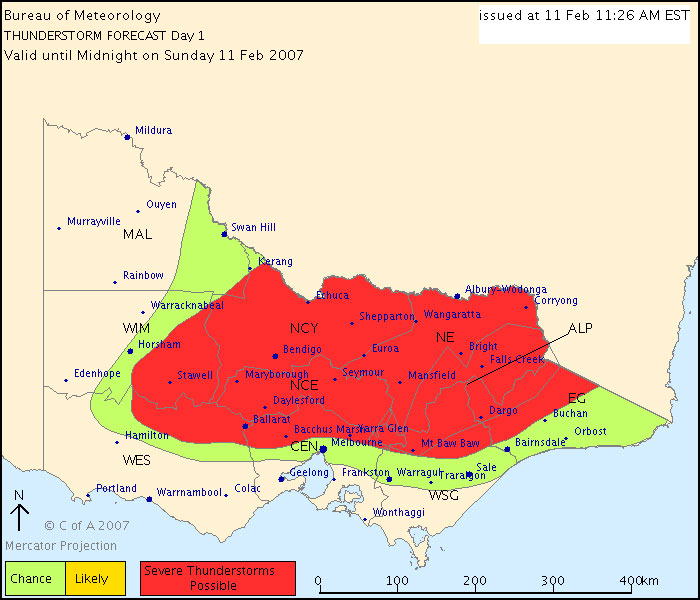 Sunday was always expected to be the 'better' day for storm development around the Ranges, and I certainly wasn't disappointed! Below is the Convective Outlook chart courtesy of Weatherzone, and the Thunderstorm Forecast Chart courtesy BoM. The animated radar is courtesy of BoM and Strike One, and shows the frames from early afternoon once convection had begun, until early evening. I have had to use the Yarrawonga radar, as the Laverton one is offline and I don't have access to Melbourne Airport radar archive.