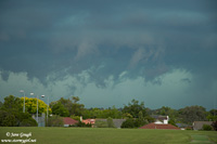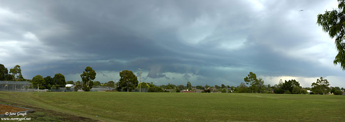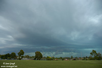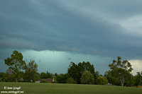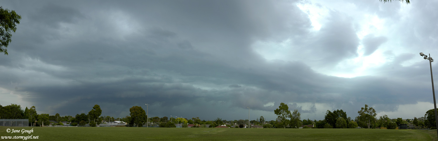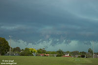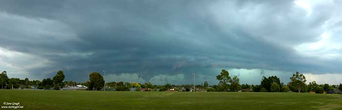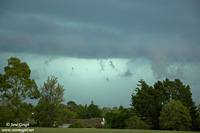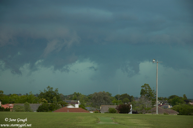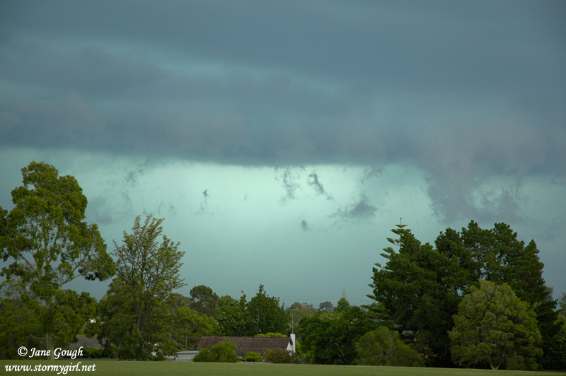 After returning home I left my children with my husband, grabbed the camera and headed to the local footy ground which has a fantastic and mostly unobstructed view towards the south. I was in absolute awe of the sight which greeted me! Greenage galore! I knew I couldn't stay there for too long, as I didn't want to get caught driving home in it, and I observed numerous CG's ahead of the main rain shaft. I wish I had also grabbed the video camera to capture the CG's and the rapid movement of the low flying scud, but in my haste I had left it at home. I was only there for 6 minutes, but took as many images of the impending storm as I could! I made a hasty retreat to the car as thunder from intra cloud lightning rumbled directly overhead.