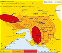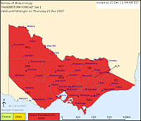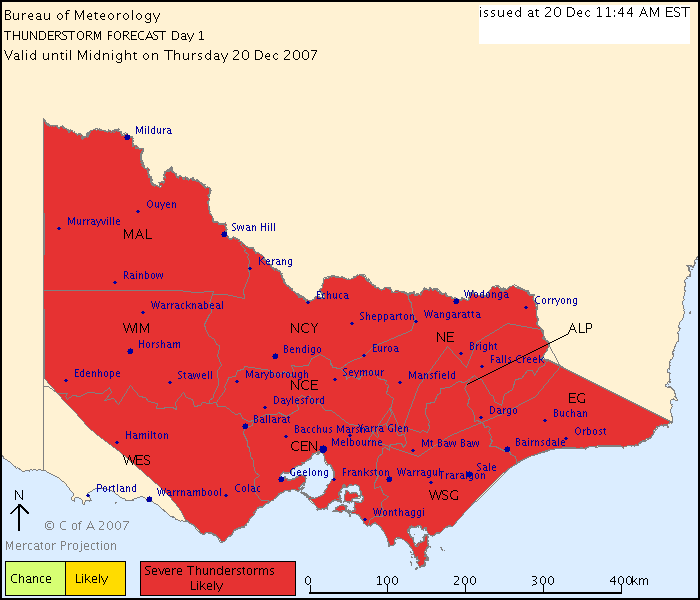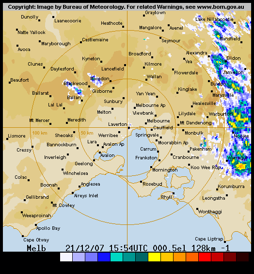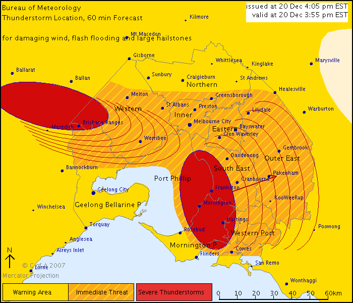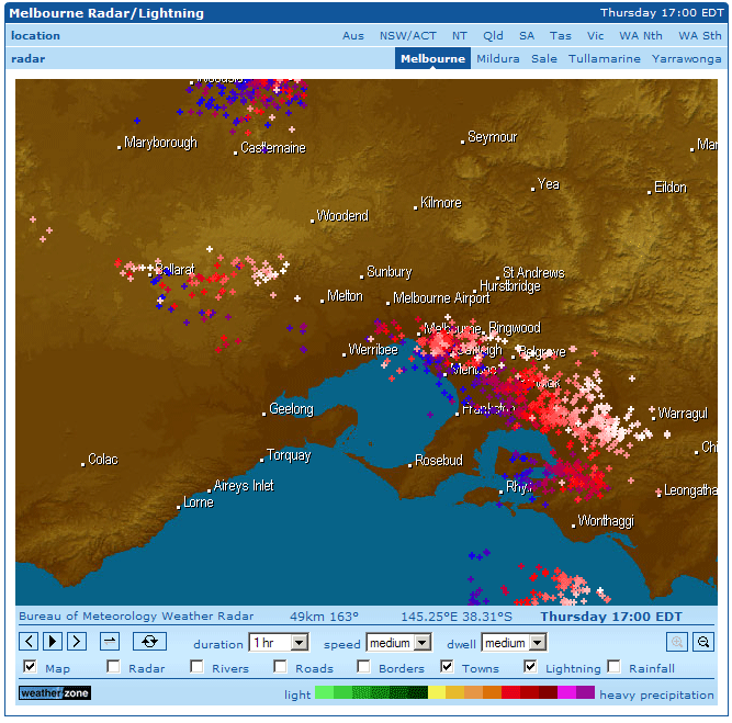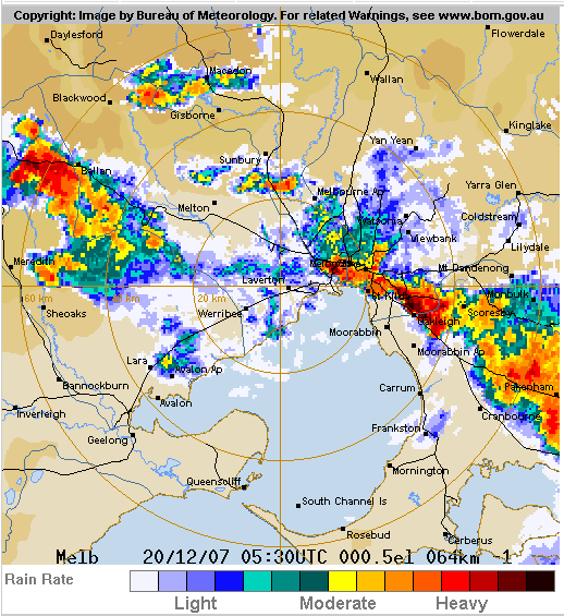 Development occurred during the morning on Thursday 20th as a line of severe thunderstorms developed around the Central Ranges (Ballan to Macedon area), and hit the CBD around 8:30am. Numerous lightning strikes and flash flooding was reported. Several tram services were thrown into chaos as lightning struck 2 trams. One was on the 67 route on St Kilda Rd, the other, a route 16 tram on the corner of Glenferrie and Gardiner Rd's in Hawthorn. Both trams had to be towed back to the depot for repair, and fortunately no one was injured.