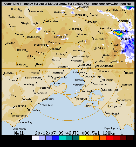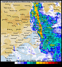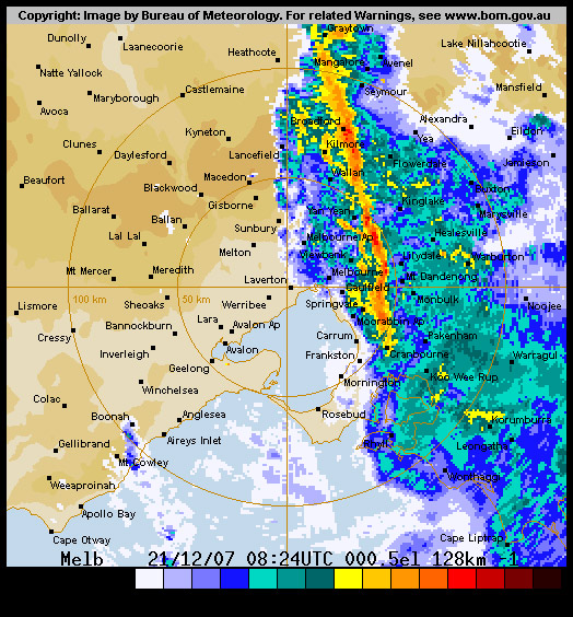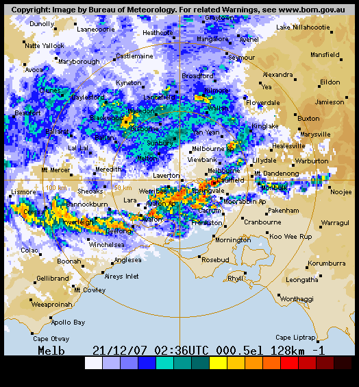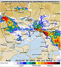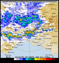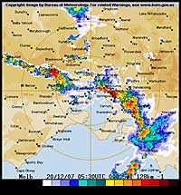 The storms reached my area by 9:20am, while I was heading to Chadstone Shopping Centre (as you do so close to Christmas!). I observed numerous CG's over the CBD and inner suburbs. The rain hit just as I was entering the underground carpark, and the noise of the thunder and torrential rain was deafening, but wonderful, to say the least! The deafening noise brought 'funny' looks from shoppers wondering what on earth was going on outside! Upon returning home, I had 7mm in the gauge, and had recorded a max rainfall rate of 45mm/h at 10.24am. The storms cleared and warnings were cancelled just after 11am, but were followed shortly by very unstable conditions and more severe storms in the mid afternoon.