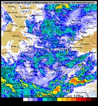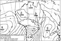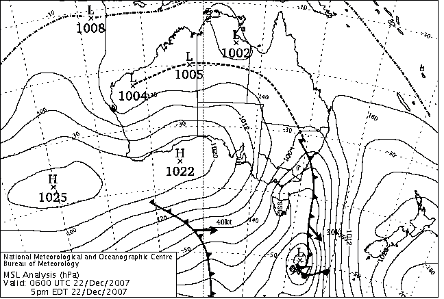 This synoptic sequence shows the passage of the trough, formation of the low and subsequent cold front from 11pm Wednesday 19th until 5pm Saturday 22nd. (200 KB file) |