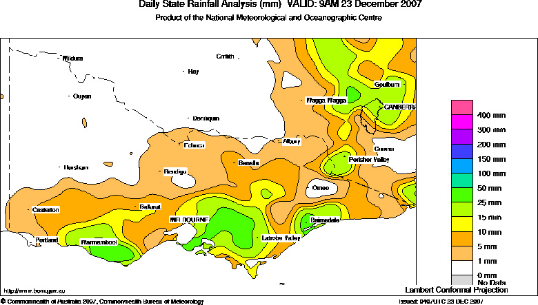 Daily rainfall analysis (mm) VALID: 9am 23st December 2007 |