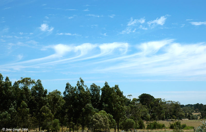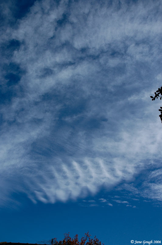 I noticed these beautiful cirrus type clouds one warm January day, and some of the features lasted until evening. The first image below is cirrus floccus with virga, while the other two images have a mix of cirrus uncinus, cirrocumulus floccus and autocumulus patches creating cirrus spissatus. (many thanks to the fellas on Weatherzone with help in the definitions!!)