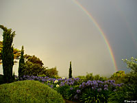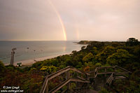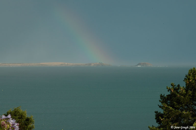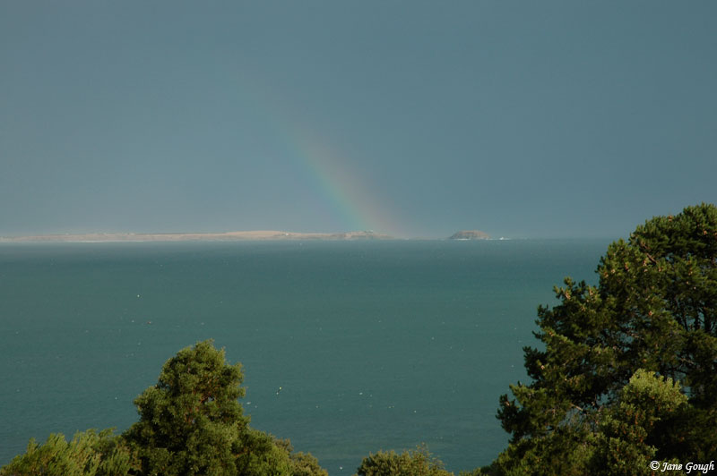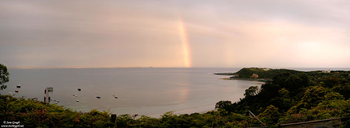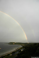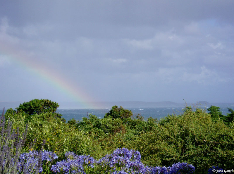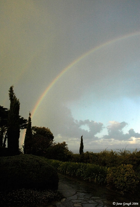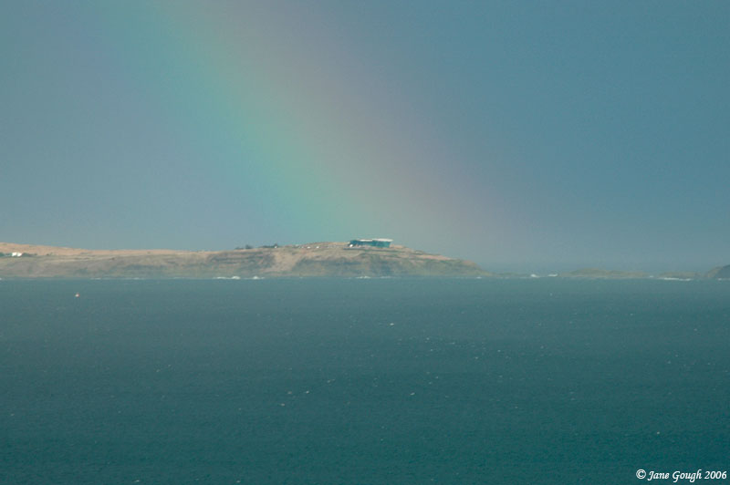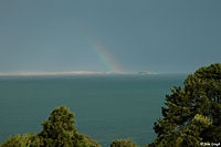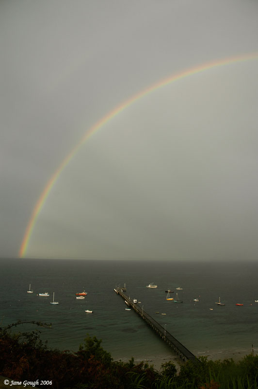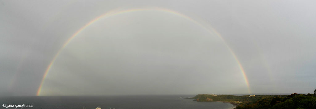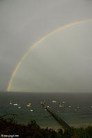 A rainbow right over the top of the Seal Rocks Centre at The Nobbies on Phillip Island, as seen from Flinders. The roof of this centre was severely damaged during a tornado in August 2002.